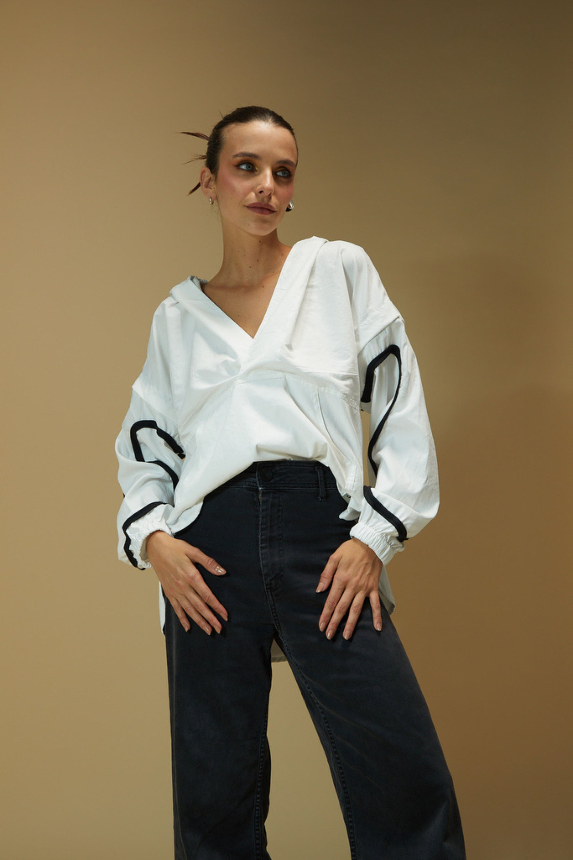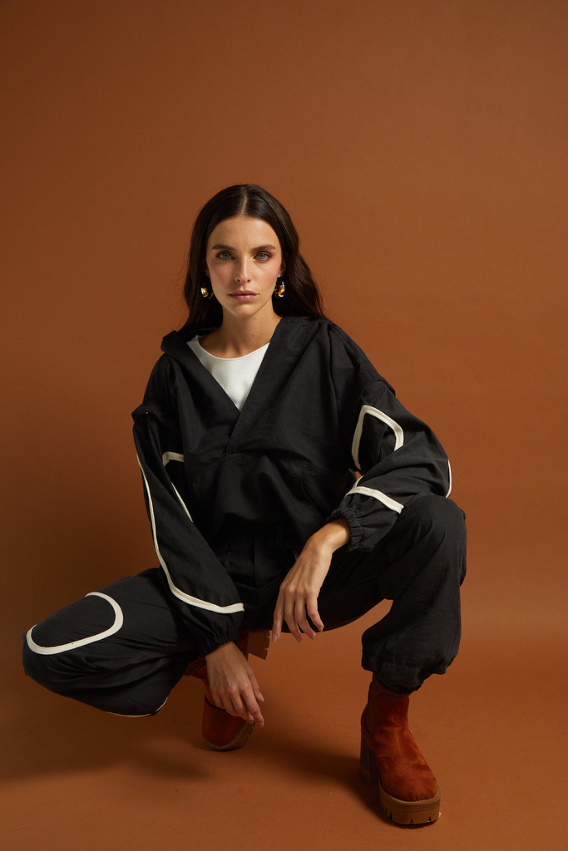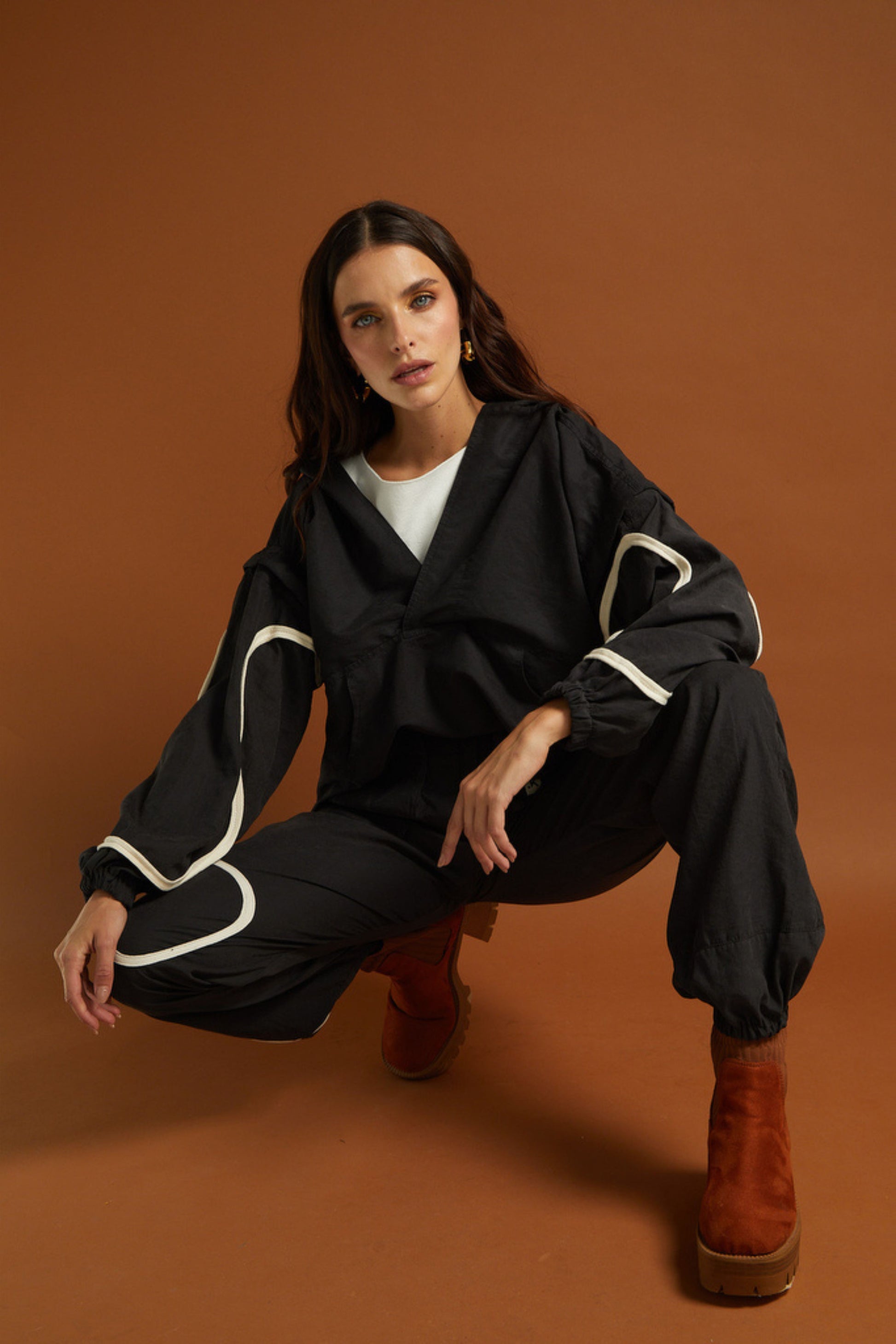 Este hoodie, confeccionado en una tela suave con tacto de piel de durazno, combina confort y estilo a la perfección. Su diseño incorpora un aplique en cordón plano de algodón que le da un toque único, convirtiéndolo en la opción ideal para quienes buscan versatilidad.